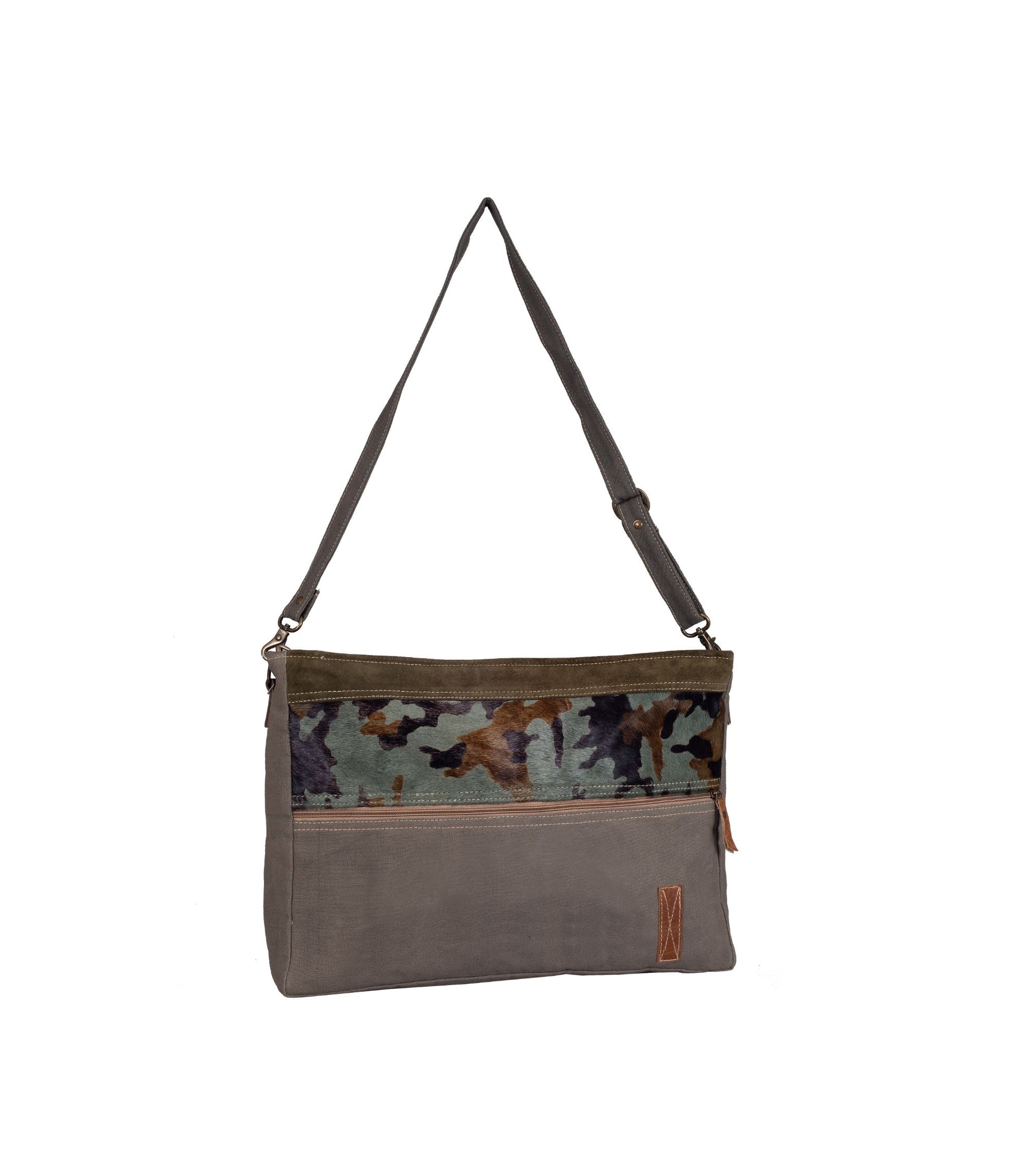 This hair-on leather and cotton fabric laptop bag comes with a jungle color palette and perfectly secures your laptop with additional space for rest of your essentials.