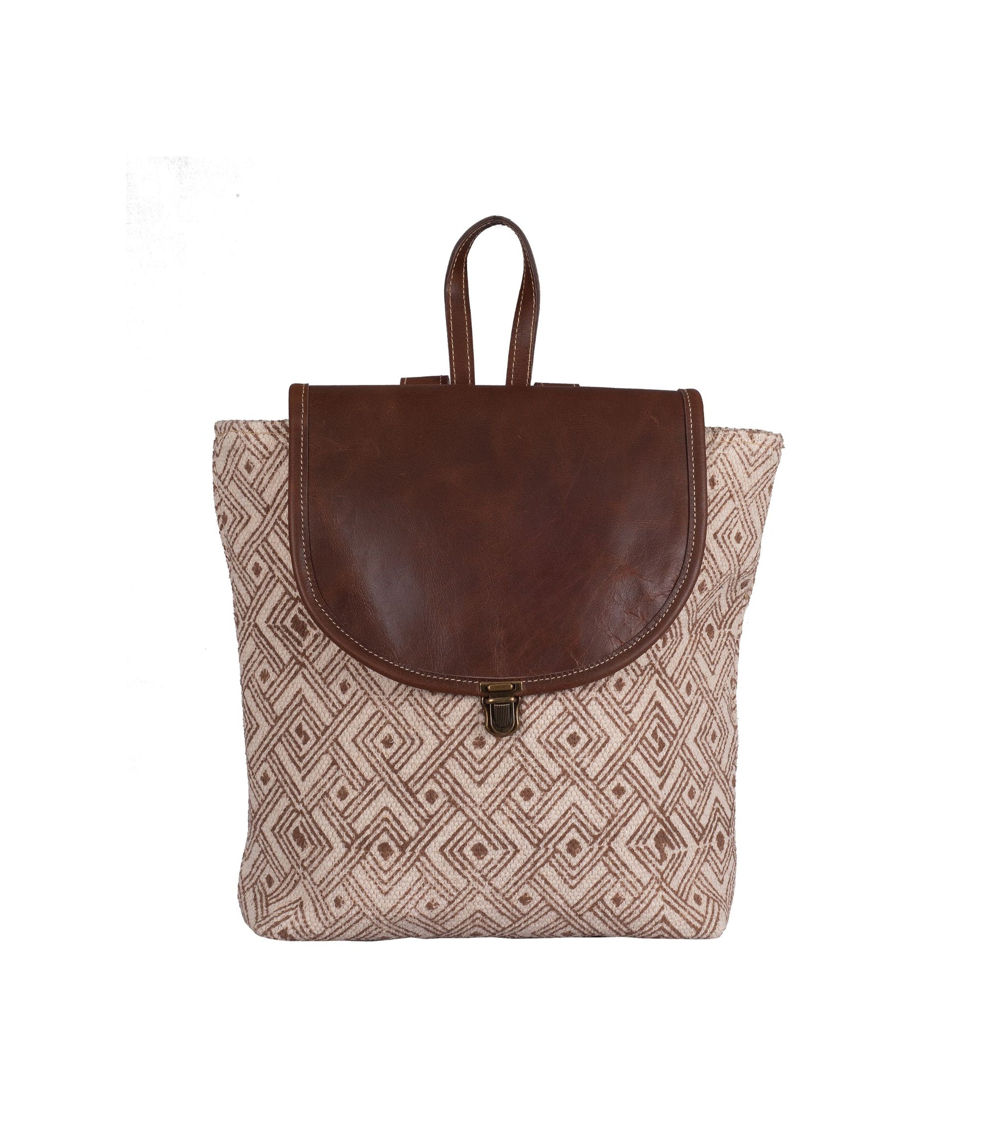 This tastefully designed, block-printed, coffee-colored, cotton fabric backpack with a brown leather flap, is all you need to kick-start your day at work.