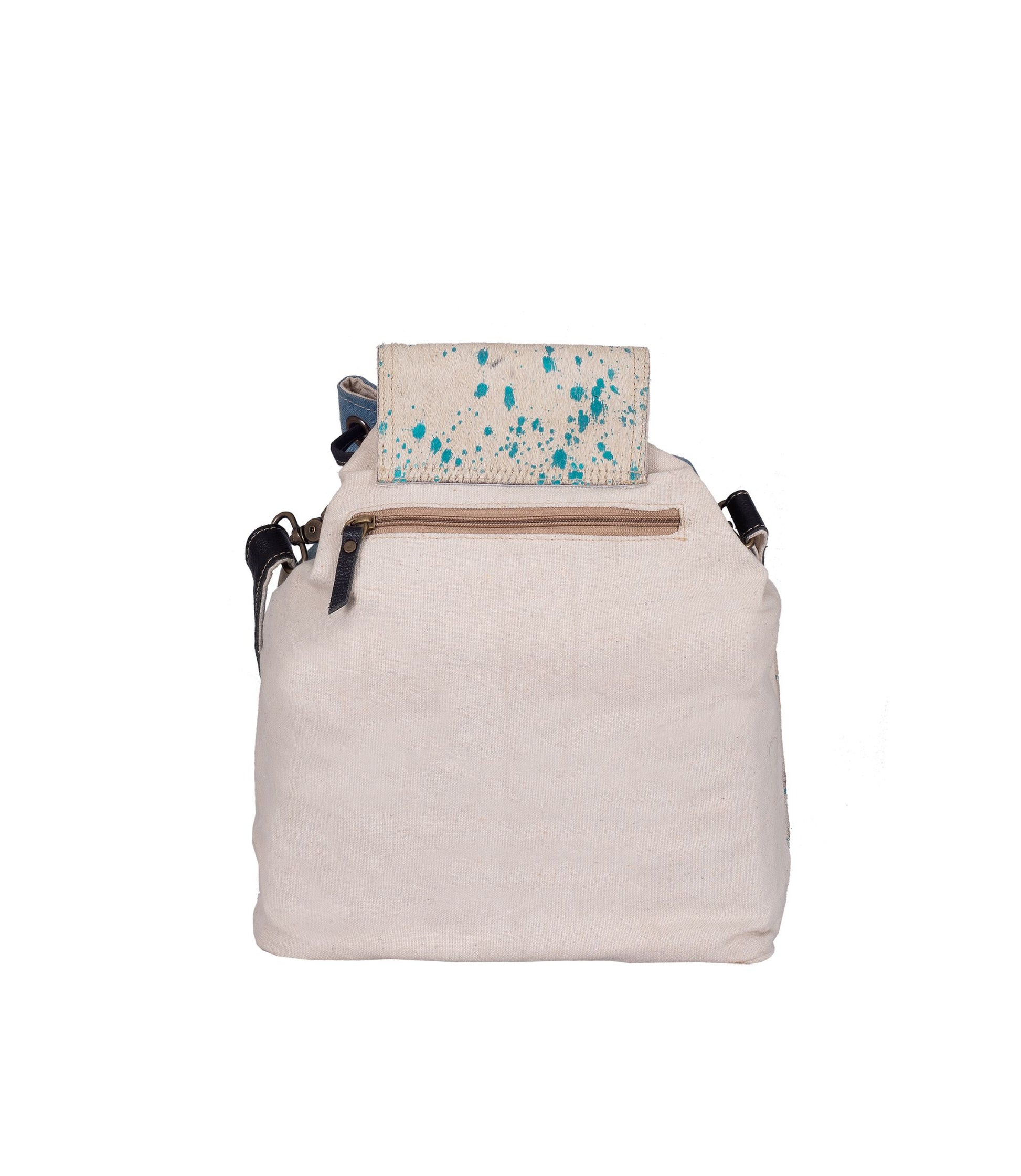 Rendition of the old-school drawstring backpacks, this unique dual-color, hair-on leather bag with shiny blue blotches is sure to take you to the seventh heaven.