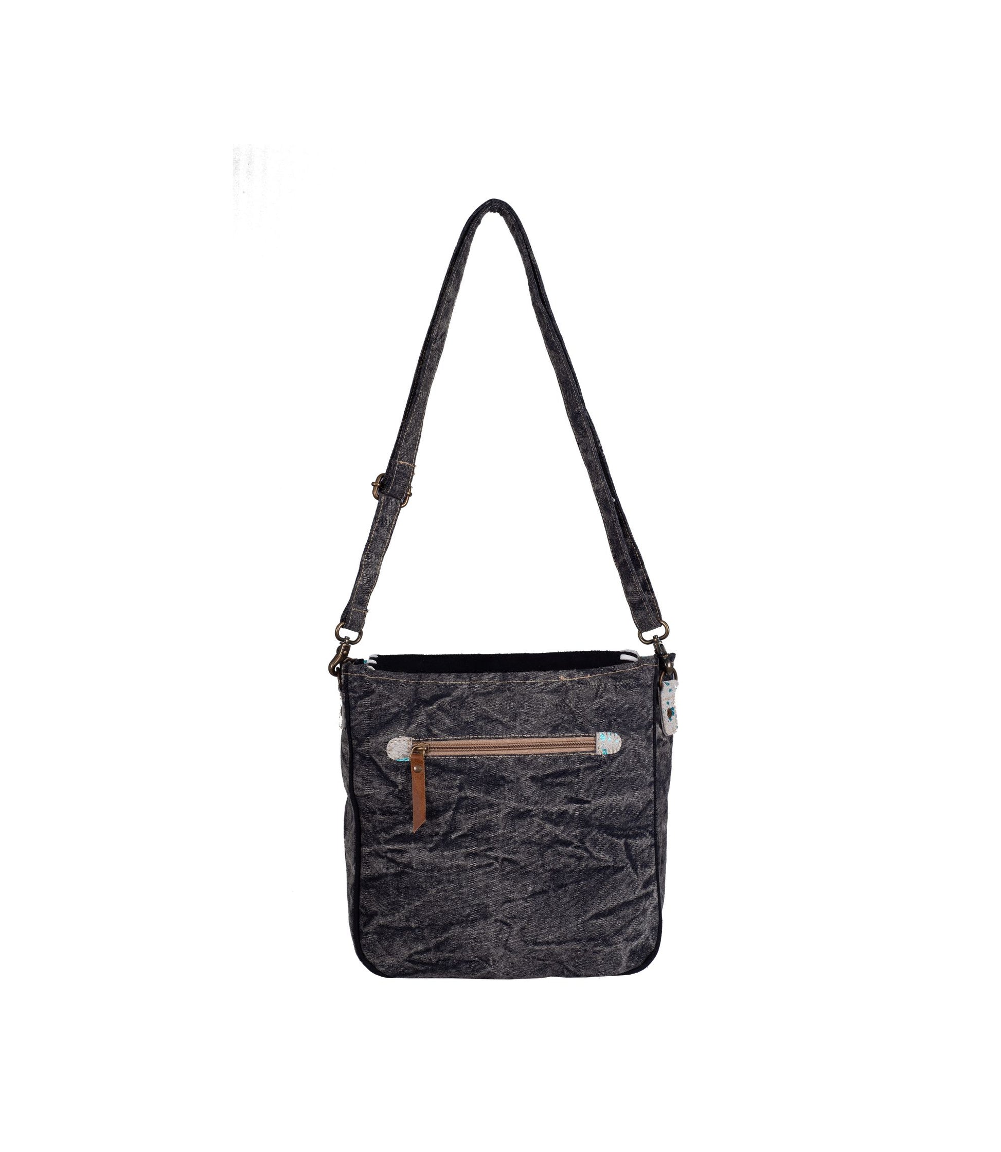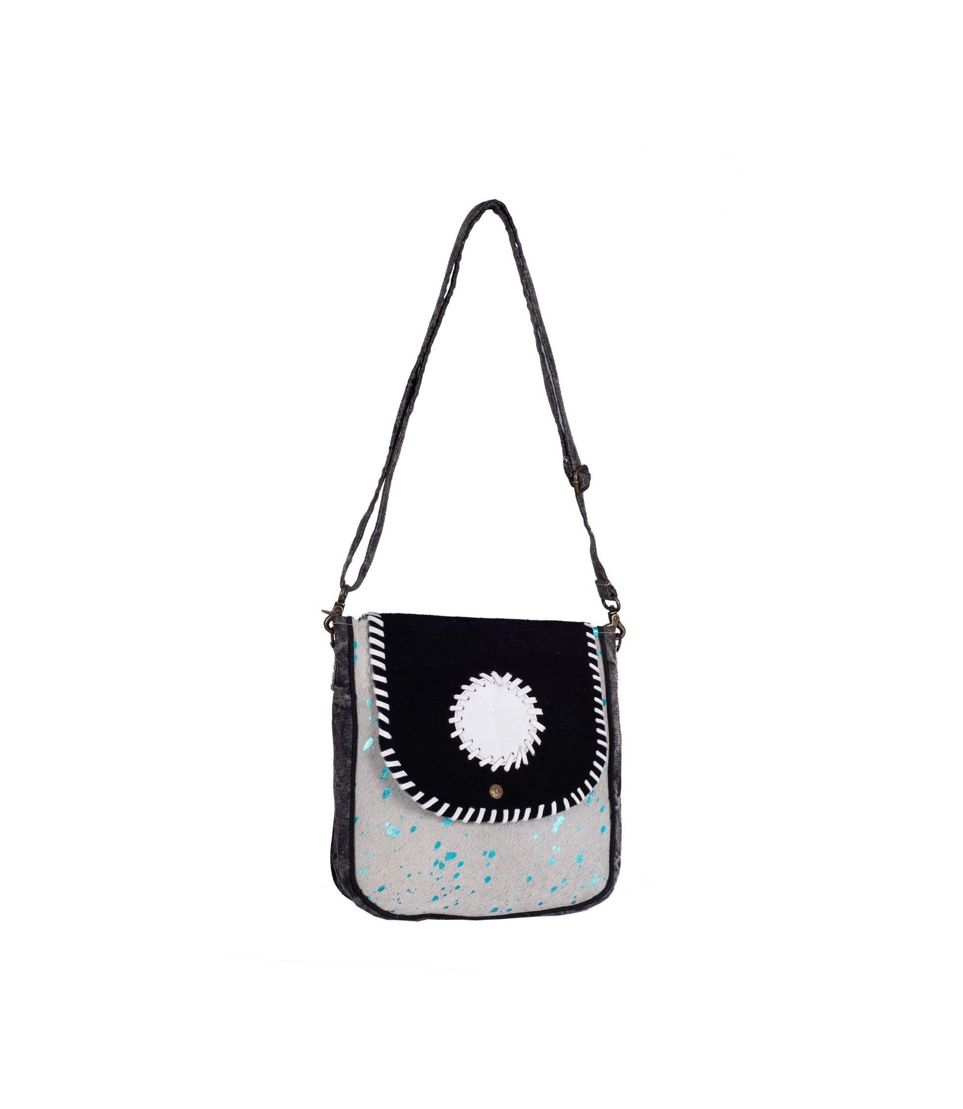 A greyish body with shiny blue blotches and a classic black and white flap makes this hair-on crossbody bag an apt choice for your sunday brunches.