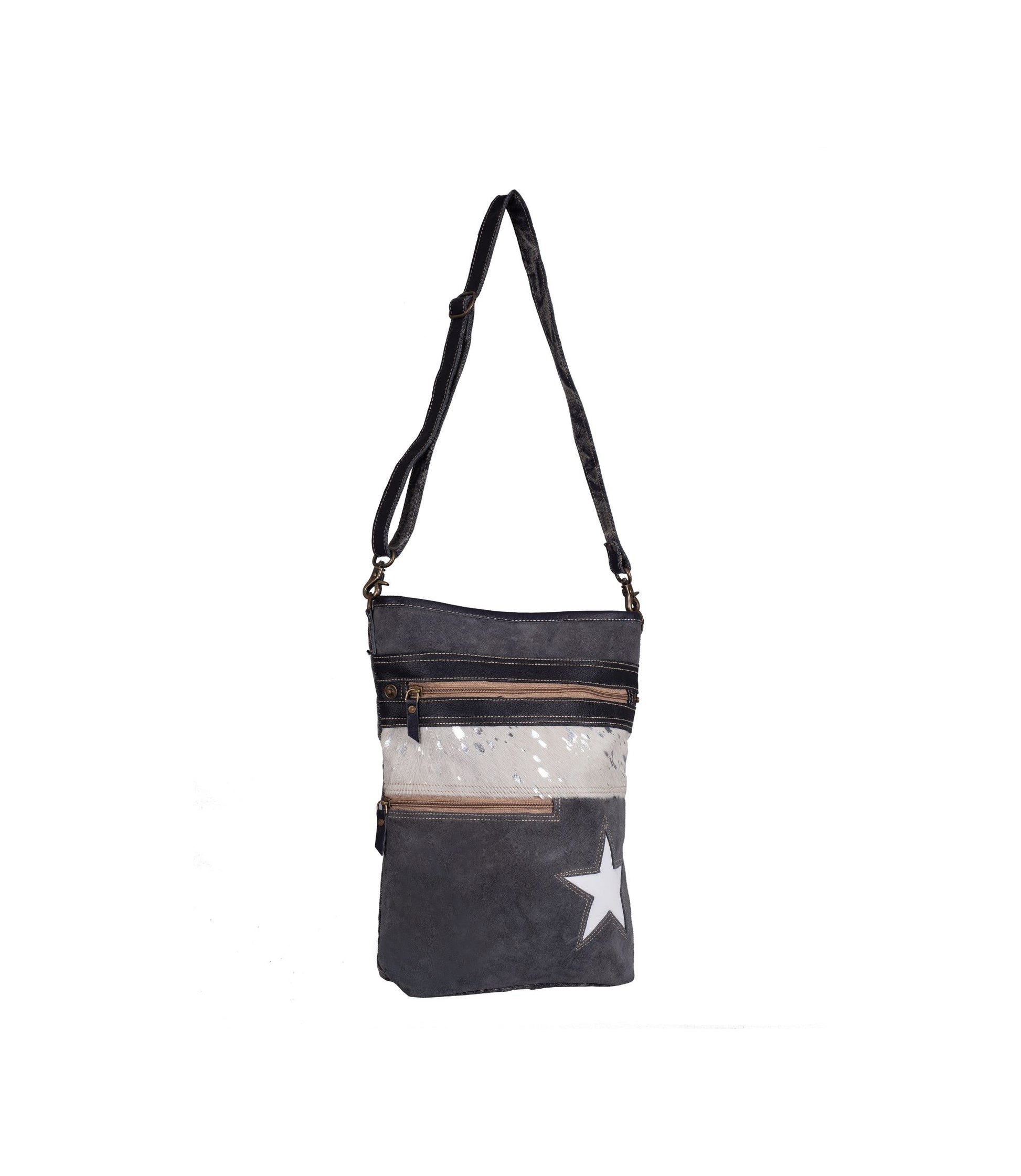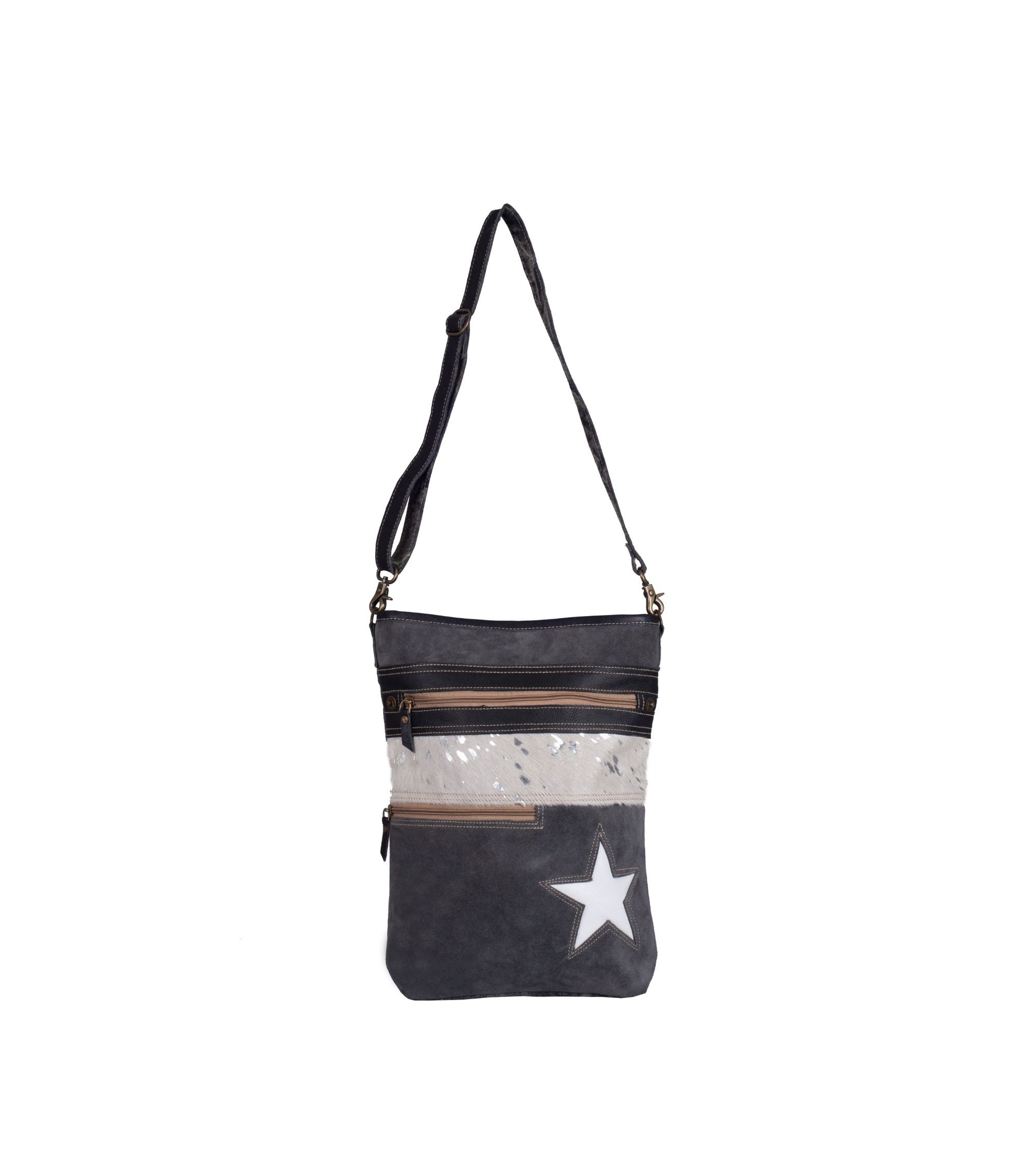 Crafted with suede and hair-on leathers, this compact crossbody bag with a sparkling center band and star patch does a smart job at ensuring an easy look be it day or night.