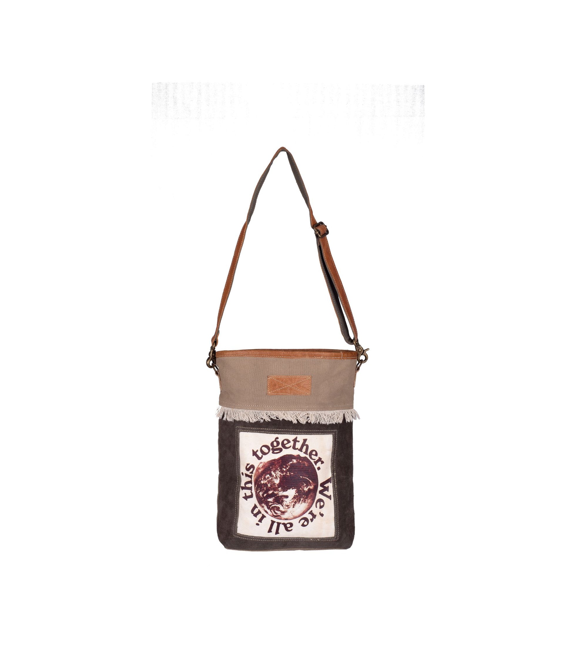 This suede leather and cotton fabric crossbody bag is specially designed for those who are compassionate and always remind us that our strength lies in our unity.